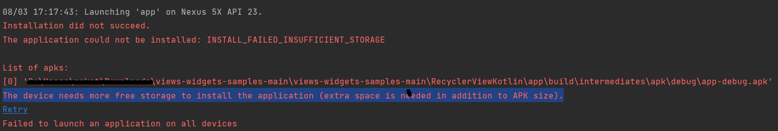 The device needs more free storage to install the application (extra space is needed in addition to APK size).